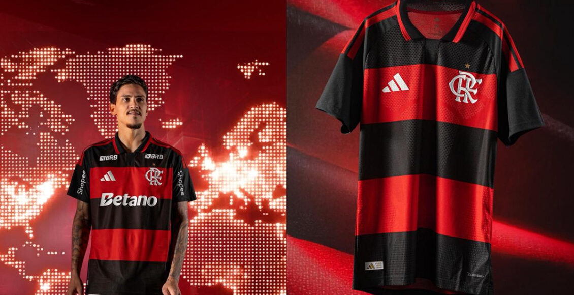 A nova camisa do Time de Filipe Luís mantém o tradicional estilo rubro-negro com listras horizontais. As mangas e a gola polo sem botão são pretas, contrastando com o vermelho das três listras da adidas, que aparecem de forma mais robusta nos ombros.
